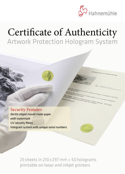 Texto y diseño del certificado pueden ser criados individualmente. En la página internet de Hahnemühle se puede descargar una proposición del certificado. La combinación entre certificado y holograma asegura que el certificado de autenticidad se refiera solamente a una obra de arte determinada. Para imprimir su certificado, usted puede descargar aquí un formulario de muestra en formato PDF.