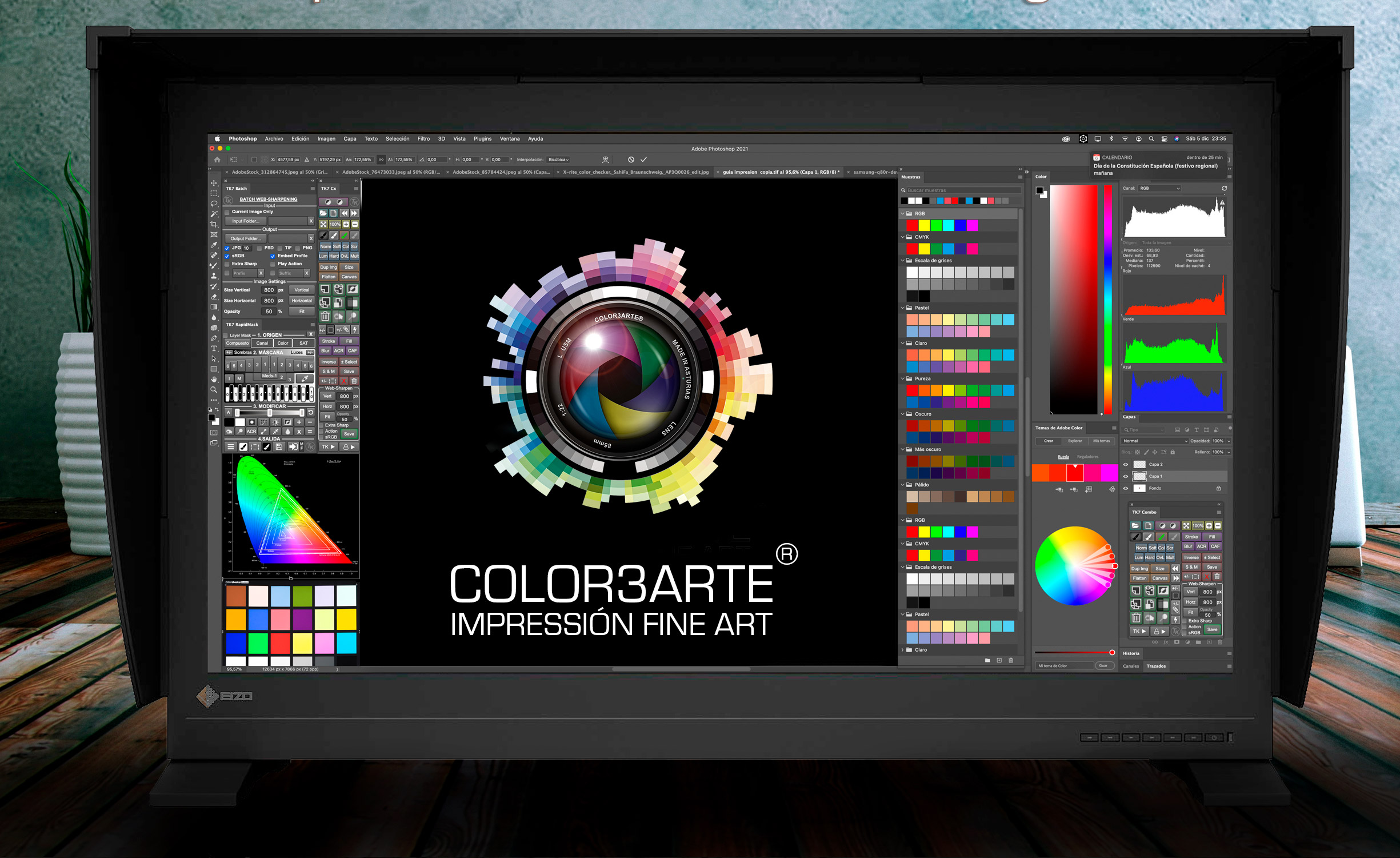 El monitor de trabajo es esencial así como su ubicación física y de cómo influye la luz de ambiente en el mismo, por lo tanto es necesario que el espacio de trabajo sea con una luz controlada. De ahí el nombre de “darkroom”. No todos los monitores muestran todos los Colores y eso no significa que no estén en el archivo de nuestra imagen, lo que ocurre es que no es capaz de representarlo. Este es el caso del 99% de pantallas que solo muestran el espacio sRGB 35% del espacio de color RGB. El otro 1% son monitores profesionales como los que usamos en color3arte que muestran entre 98 y 100% del espacio RGB.